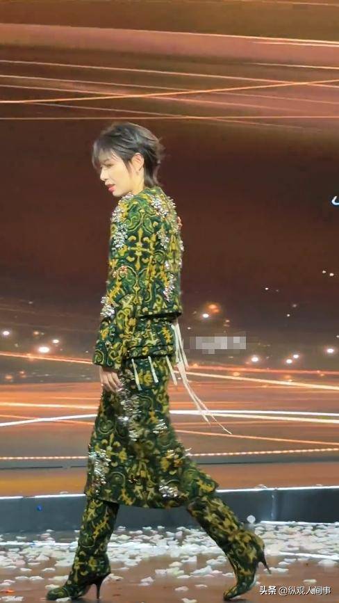 她还准备了另一套造型,是一身印花西装搭配短裙,踩着高跟鞋亮相。不过那花色嘛,被不少人调侃像“韭菜炒蛋”,土酷土酷的,穿出来走红毯也是需要勇气的。