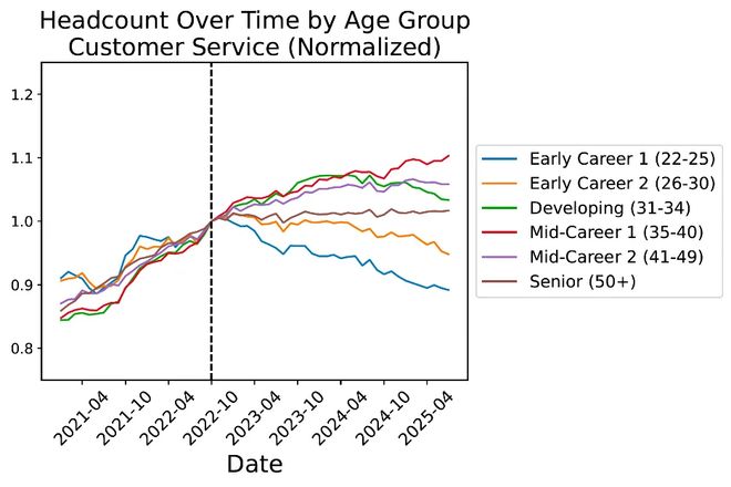 论文的结果中最令人意外的一点,是AI冲击如此集中地落在了刚踏入职场的年轻人身上。