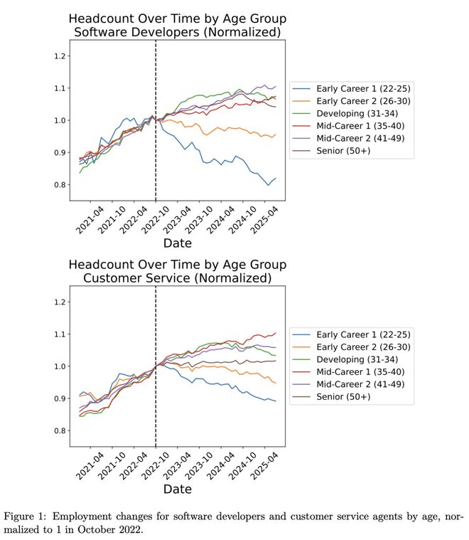1、在AI高度渗透的岗位(软件开发、客服等),年轻人的就业率正在快速下滑;