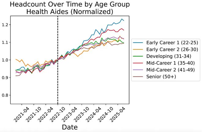 在这些岗位上,22至25岁群体的就业增长反而最快。这从侧面验证了Hinton建议的正确性。