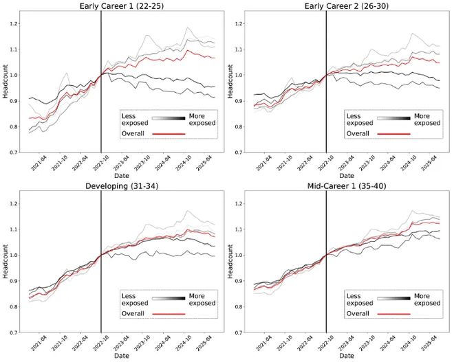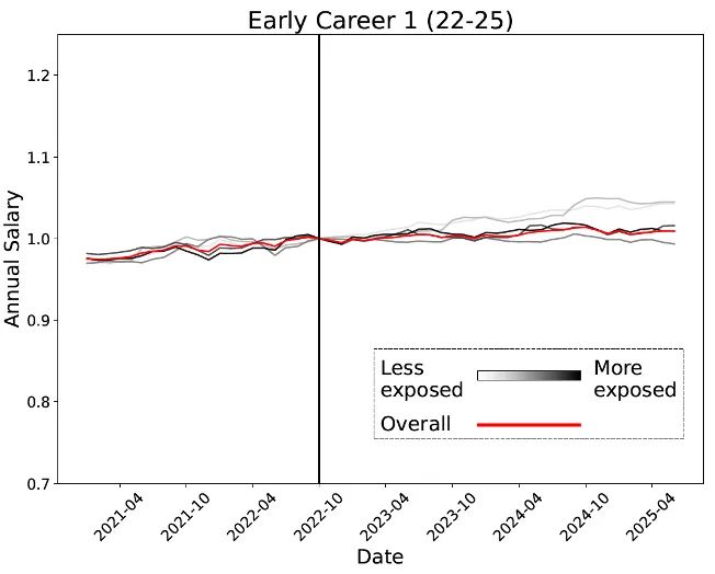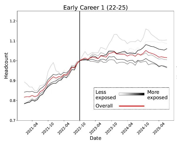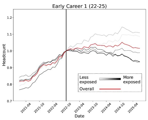 对于22至25岁的人群,在受AI影响最小的职业中就业率在上升,但在受AI影响最大的职业中则显著下降。